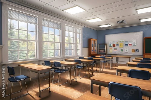 Empty Classroom with Desks and Windows