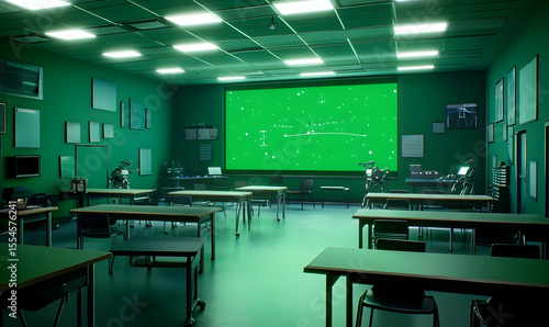 Empty classroom with desks, chairs, and a green screen for educational and technology concepts