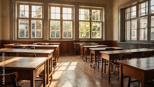 Empty classroom with natural light streaming through windows