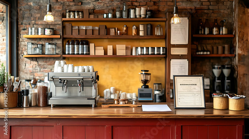 Empty Coffee Shop Counter with Espresso Machine and Shelves Full of Supplies