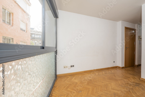 Empty living room with a large gray anodized aluminum window with glass covered with a translucent film, oak floor and smooth white walls