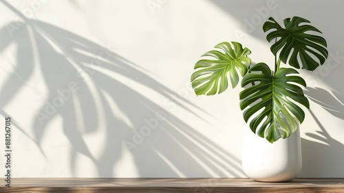 Empty modern, minimal counter, table top, green monstera in sunlight, leaf shadow on white outdoor wall in background