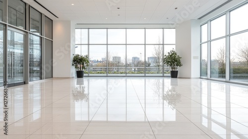 Empty modern office lobby with city view. Possible use Commercial space