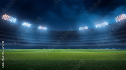 Empty night stadium with bright lights illuminating green field and dark stands.