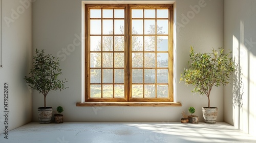 Empty room with large window, plants