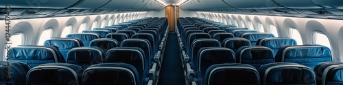 Empty Rows of Seats Inside Airplane Cabin, Perspective View, Travel and Transportation Concept
