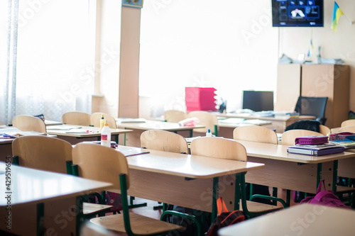 Empty school class. children left classroom during quarantine. Abandoned books and backpacks.