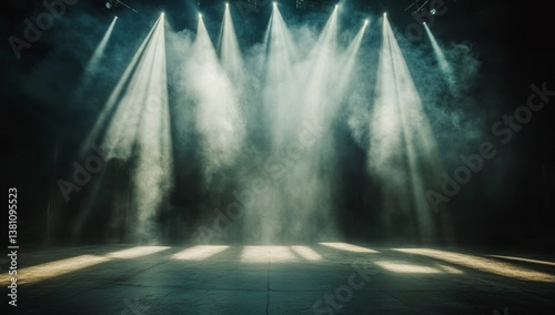 Empty stage lit by spotlights with smoke, performance venue