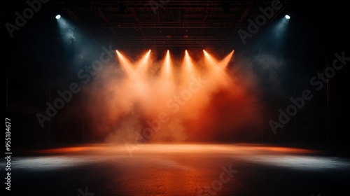 Empty stage with dramatic lighting, creating an atmospheric and cinematic effect, perfect for theater or performance concepts.