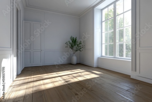 Empty, sun-drenched room with white walls, light wood floors, and a potted plant