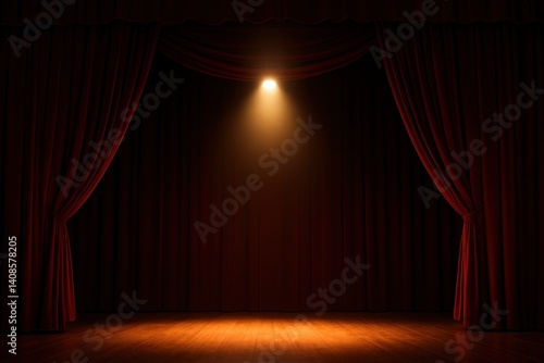 Empty Theater Stage With Spotlight and Red Curtains Creating Dramatic Ambiance for Performance and Presentation Themes in Stock Photography and Creative Design Projects
