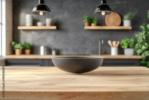Empty top table for product or food montage with modern kitchen room background with generative ai