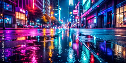 Empty Urban Street Blur: An empty urban street with wet asphalt and the reflection of neon lights, creating a cool and modern backdrop.