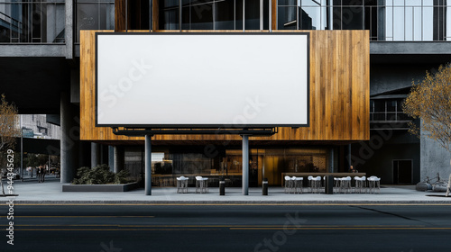 Empty white billboard above an outdoor seating area of a modern building on a city street.