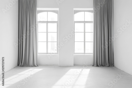 Empty white room with large windows and drapes, bright sunlight streaming in