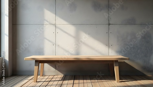 Empty wooden table in room with concrete wall and sunlight creating shadows
