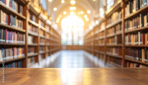 Empty wooden table surface with a beautiful blurry background of a classic library hall, shelves full of old books, and warm light.