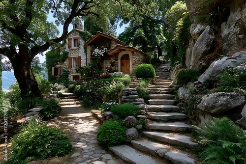Enchanted forest cottage with stone stairs high resolution picture