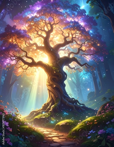 Enchanted forest scene featuring a luminous tree, and a stone path