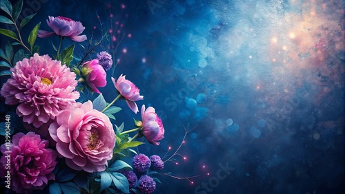 Enchanted Pink Peonies and Purple Flowers on a Dreamlike Blue Background