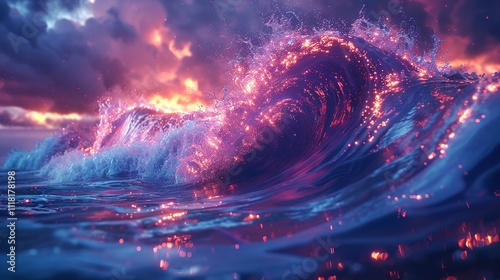 Enchanted wave in a neon-lit seascape, vibrant colors blending and reflecting on the ocean surface.