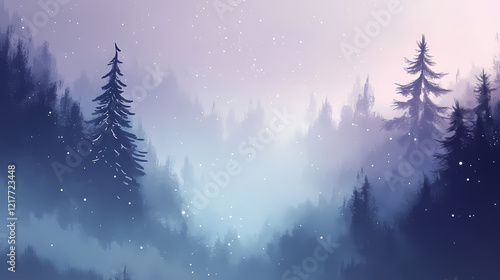 Enchanted winter forest with snow, shimmering star lights and mysterious fog isolated with white highlights, png. Shimmering Forest. Illustration