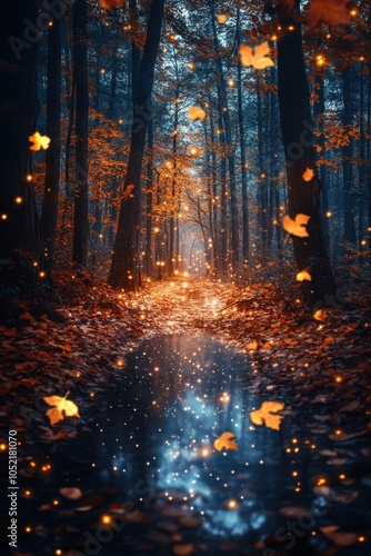 Enchanting autumn woods illuminated by glowing lights and falling leaves near a tranquil stream at dusk