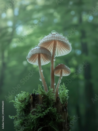 Enchanting fairy ring mushrooms on a mossy stump, forest backdrop