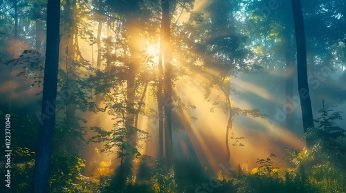 Enchanting Misty Forest Bathed in Golden Sunrise Radiance