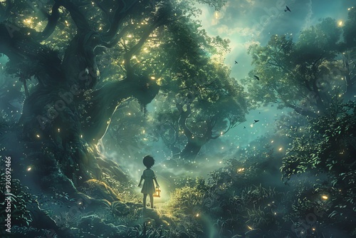 Enchanting Night Forest Scene with a Curious Child and Lantern.