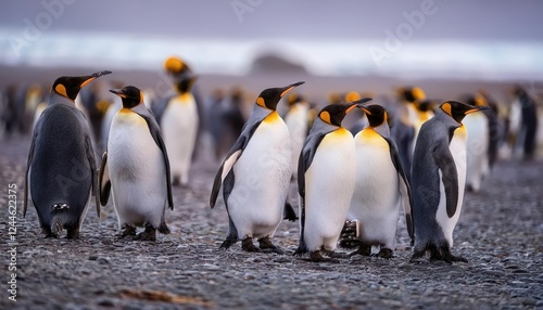 Enchanting Okum Boy King Penguins in Downy Plumage Gather on South Georgia Island, Basking in the Soft Light of the Southern Ocean