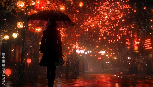 Enchanting Rainy Night Scene with Lanterns, Umbrella, and Silhouette of a Woman in a Cozy Urban Setting