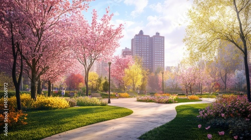 Enchanting urban oasis, blooming cherry trees, gentle path and peaceful ambiance