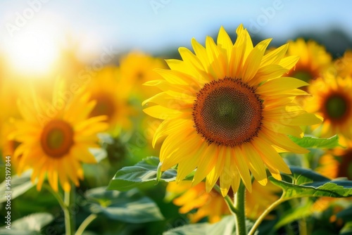 Endless field of sunflowers illuminated by the sun, harvest and agricultural business concept