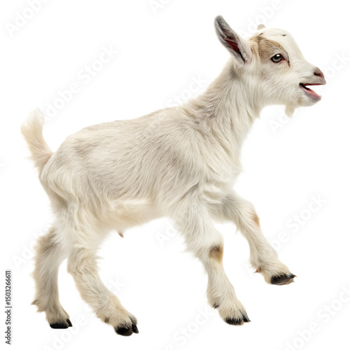 Energetic baby goat kid jumping playfully isolated on a transparent background