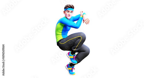energetic cartoon athlete dynamic jump, active pose, vibrant fitness, isolated on transparent background