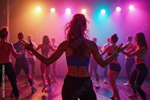 Energetic dance class with diverse group exercising under colorful stage lights.
