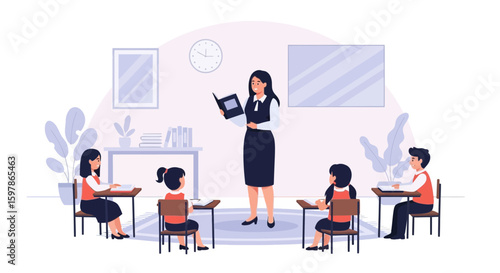 Engaging Lesson: Teacher Reads to Eager Students in a Bright Classroom