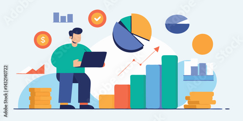 Engaging vector illustration of a person analyzing data with charts and graphs in a digital workspace setting