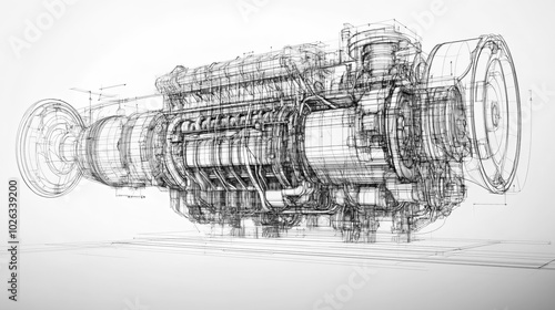 Engine pencil sketch in a wire-frame style, resembling a blueprint.