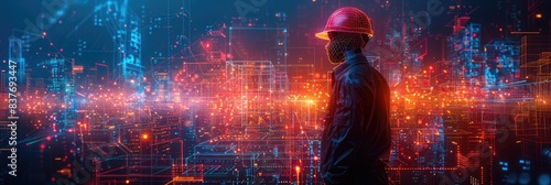 Engineer in a hard hat observing a digital hologram of a futuristic cityscape, blending technology with urban planning.