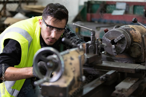 engineer man or factory worker worker milling or working on the machine in factory