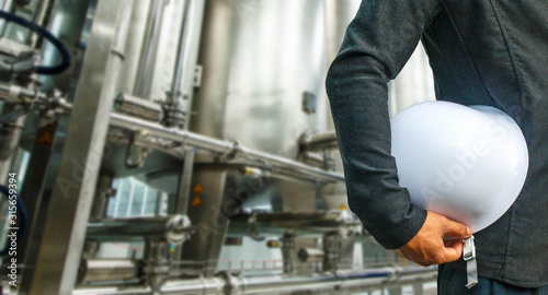 engineer suit white helmet for security stood on the details of shiny stainless steel pipes, tanks for the food industry.