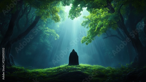 Enigmatic figure in woods under glowing rays of light, mystical atmosphere in enchanting forest setting