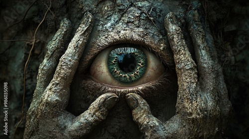 Enigmatic Oversized Eye: A Captivating Poster for Your Sporty Interior, Revealed by Clay-like Hands in a Dark Woodland, Surrounded by Rocks and Vines – Perfect for Adding Intrigue!
