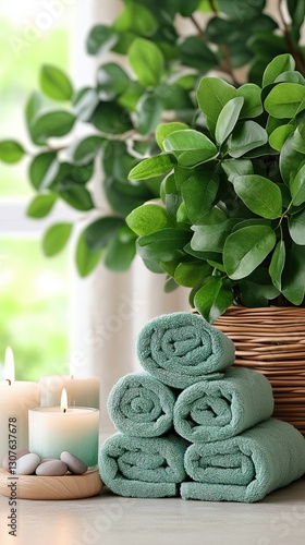 Enjoy a tranquil spa setting with rolled towels, glowing candles, and lush plants creating a peaceful atmosphere for beauty treatments