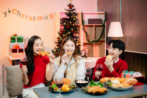 Enjoy the holiday spirit with a joyful Christmas celebration featuring friends, festive food, Santa hats,
