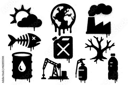 Environmental crisis symbols with pollution, deforestation, and climate change in graffiti style, Transparent Background