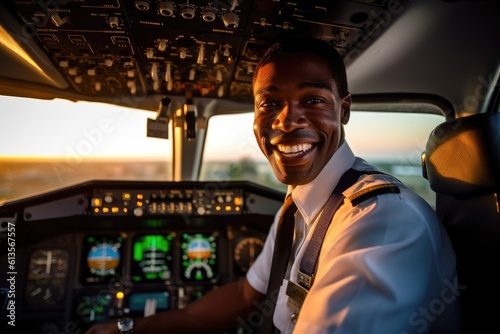Environmental portrait of a pilot in the cockpit of an airplane, ready for takeoff. Generative AI