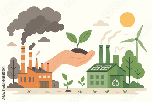 Environmental Transformation Vector Illustration with Hand Holding Green Seedling, Contrasting Polluting Factory and Eco-Friendly Green Industry, Sustainable Development Concept with Renewable Energy